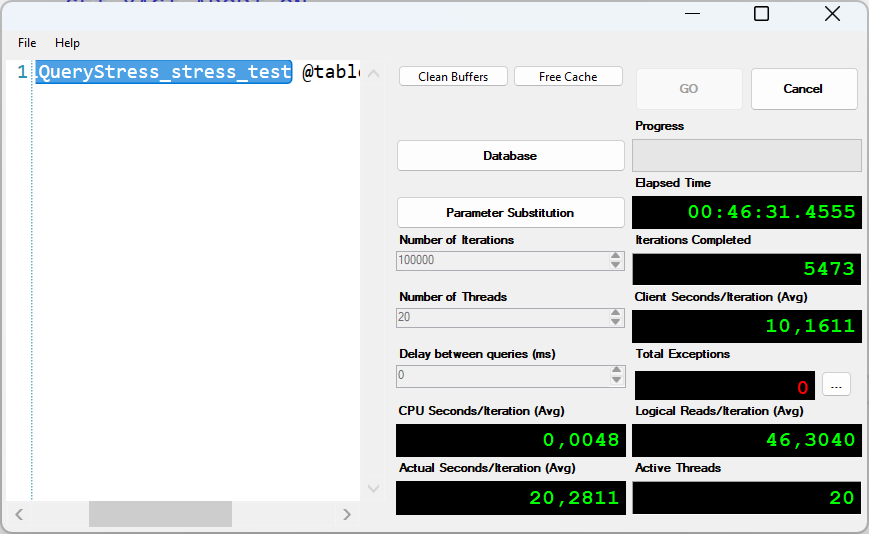 The problem analysis is a bit tricky. When the stored procedure dbo.SQLQueryStress_stress_test is executed with SQL Query Stress, you quickly notice that the IO is constantly increasing. More IO means longer runtime.